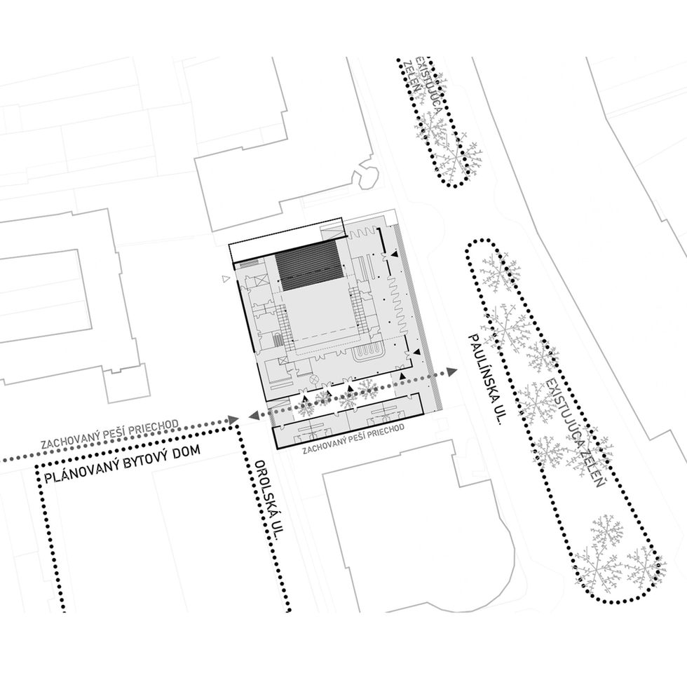 Objekt je zasadený identicky ako pôvodný, ale lepšie reaguje na nové vzťahy v území. Revitalizácia „uličky“ medzi ulicami Paulínska a Orolská vytvára aktívny parter s malými obchodmi, kde sa nachádza aj hlavný vstup do sály. Objekt ostáva priateľský k rušnej ulici, čo je podporené umiestnením kaviarne, ktorá smeruje do ulice a prináša pohyb a život do interiéru.